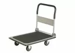 Carrello piattaforma in lamiera rinforzata con maniglia tubolare ripiegabile tramite comando a piede.
