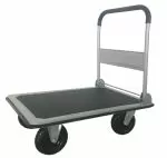 Carrello piattaforma in lamiera rinforzata con maniglia tubolare ripiegabile tramite comando a piede.